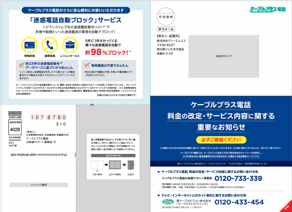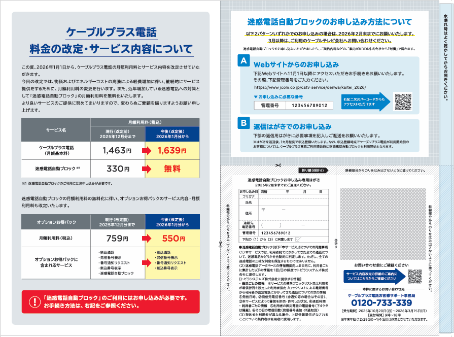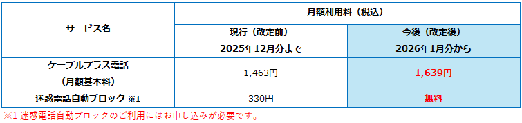 2026年1月より、「迷惑電話自動ブロック」はケーブルプラス電話の月額基本料金に標準付帯となるため、