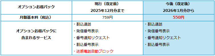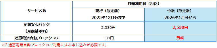 2026年1月ご利用分より下記のとおり改定させていただきます。 また、今回の料金改定に合わせ、近年増加している迷惑電話への対策として
