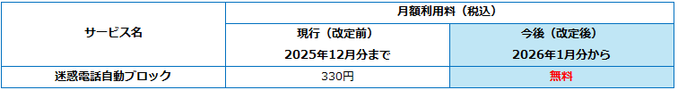 (2026年1月ご利用分から、迷惑電話自動ブロックの月額利用料は自動的に無料となります)。