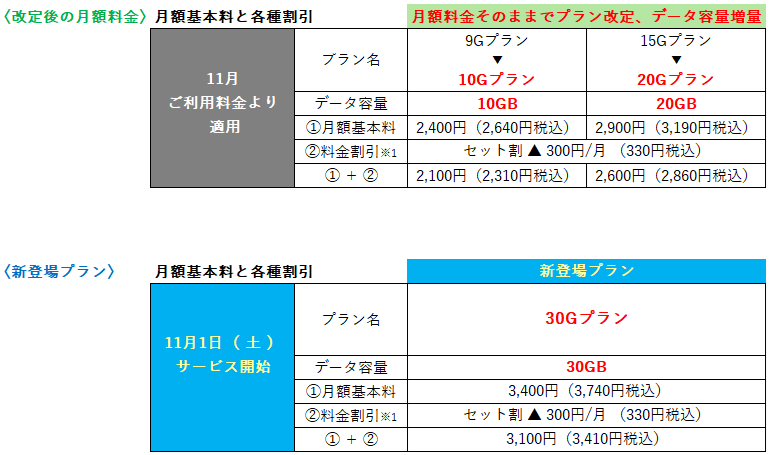 お手続き不要で『9GB ➔ 10GB』『15GB ➔ 20GB』にそれぞれ増量し、提供プランの改定をさせていただきます。