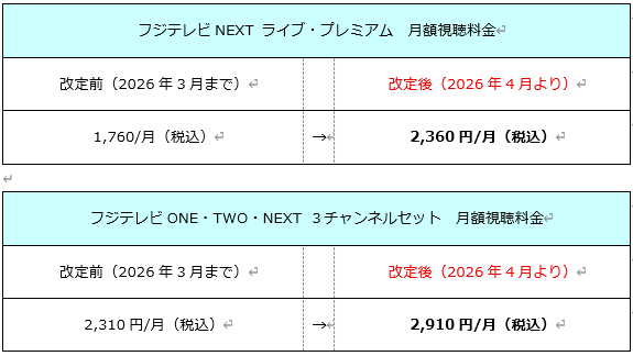 さて、この度、株式会社フジテレビジョンが運営しております有料チャンネル「フジテレビNEXT ライブ・プレミアム」につきまして、2026年4月1日(水)より、以下の通り視聴料金を改定させていただくことになりました。